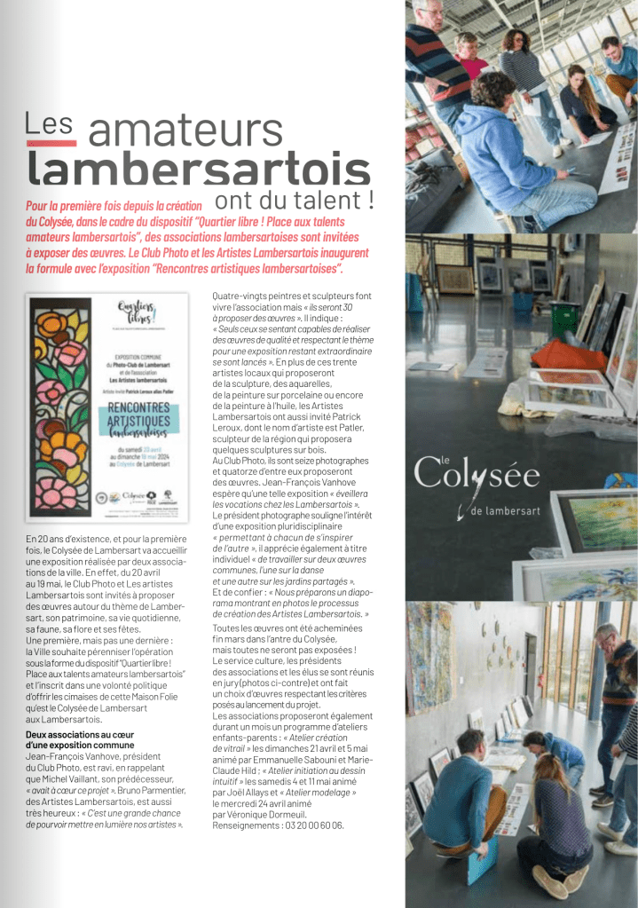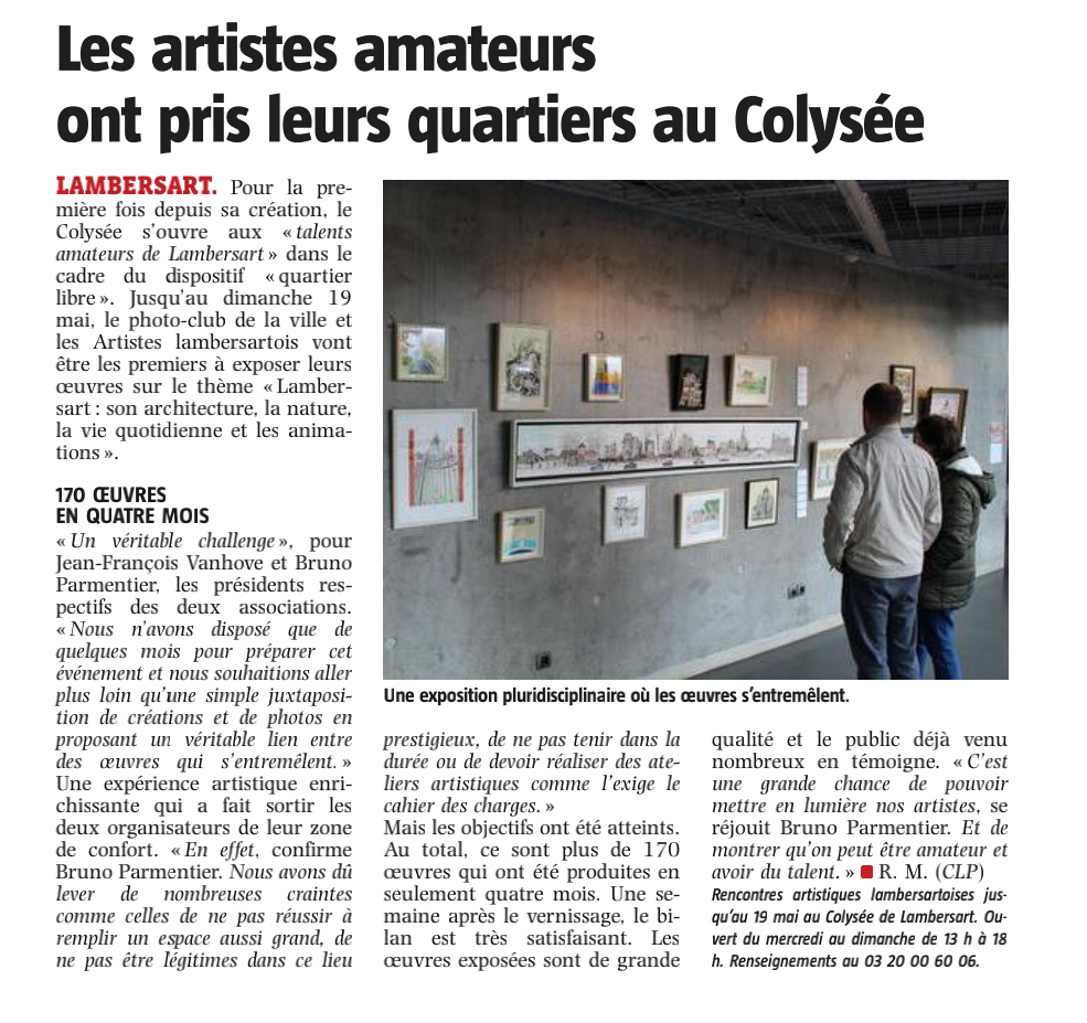 Bonsoir, Bravo pour le reportage sur l’Expo au Colysee ! Par ailleurs j’ai de très bons échos de visiteurs qui m’envoient mails ou SMS de félicitations et sont admiratifs de la qualité et variété des oeuvres exposées sur le thème « Lambersart ». Ça fait plaisir! A suivre….