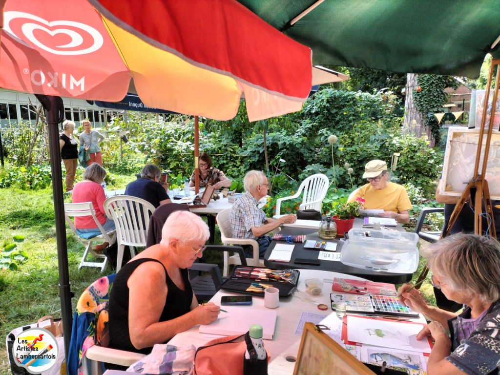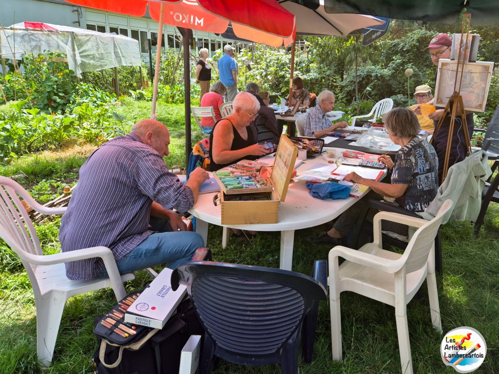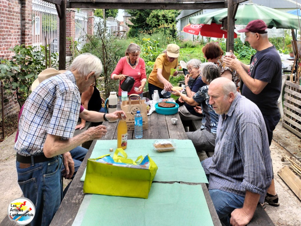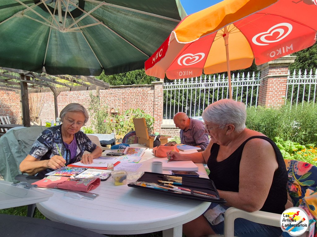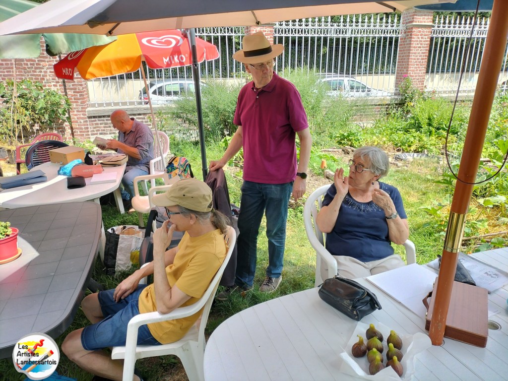 Le lundi 28 juillet, nous étions une dizaine d’adhérent(e)s à répondre à l’invitation de Marie-Claire pour une séance de peinture et dessin au Jardin des Quat’ Sous (jardin partagé) à Lambersart.
