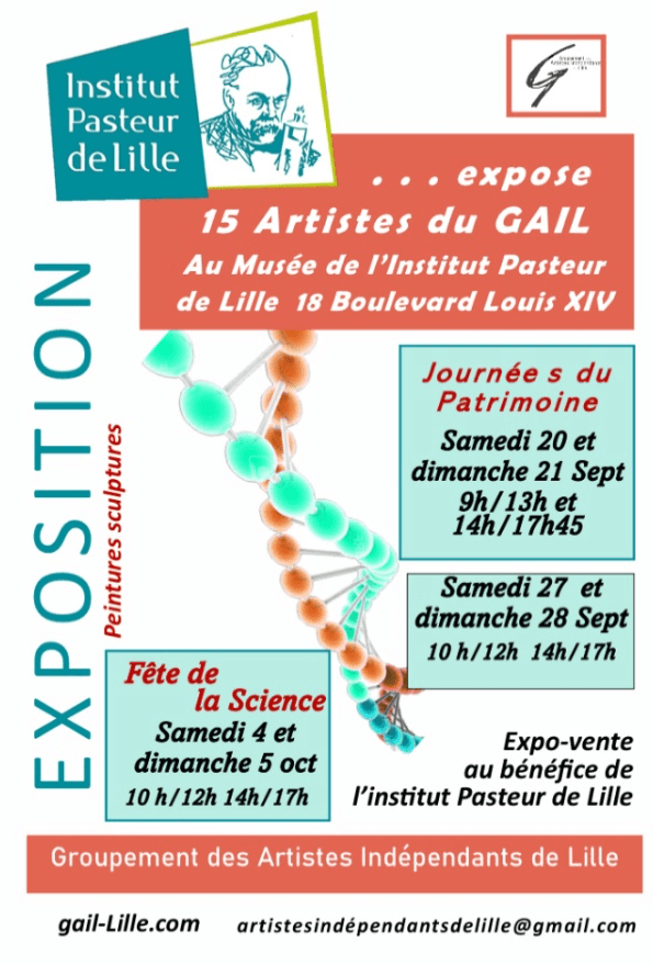 Le GAIL (Groupement des Artistes Indépendants de Lille) à l’Institut Pasteur (voir sur un plan). Quelques uns de nos adhérent(e)s font également partie du GAIL et y exposeront : Nadejda Clément, Pierre Micard, Jean-Daniel Fardel…