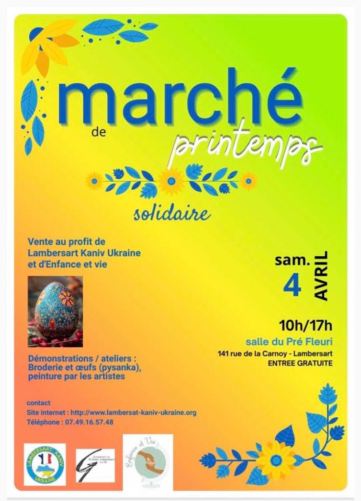 Plusieurs de nos adhérent(e)s vont proposer des oeuvres pour le marché de printemps solidaire organisé par le Groupement des Artistes Indépendants de Lille (GAIL), au profit de deux associations lambersartoises : Lambersart Kaniv Ukraine et Enfance et Vie. Le samedi 4 avril, salle du Pré Fleuri à Lambersart (voir sur un plan).